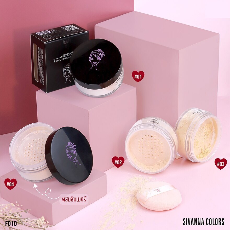 Sivanna Colors Loose Powder Shine-Control Sheer-Long Wear. Loose Powder. Smooth And Light Texture. Suitable For Layering Over The Face After Applying Foundation Or Concealer. Loose Powder Has The Property To Make The Skin Look Smoother And More Natural. Help Absorb Oil On The Face. Can Be Filled During The Day Without Stains. Helps To Smooth The Face. Oil Control And Helps Cover Pores Smoothly. Enhances The Radiance and Perfection Of Bright And Youthful Skin. Features Skin Rejuvenation. Adjust The Skin To Be Smooth And Look Consistent. And Adjust The Skin Tone To Be Brightening For A Longer Perfect Makeup. There Are 2 Number To Choose. Quantity 20 Grams