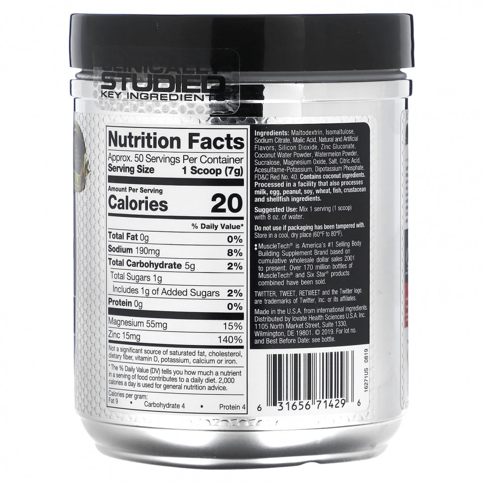 мальтодекстрин, изомальтулоза, цитрат натрия, яблочная кислота, натуральные и искусственные ароматизаторы, диоксид кремния, глюконат цинка, порошок из кокосовой воды, арбузный порошок, сукралоза, оксид магния, соль, лимонная кислота, ацесульфам калия, дикалийфосфат, fdиc red no. 40.