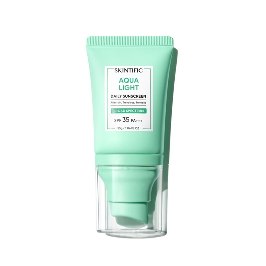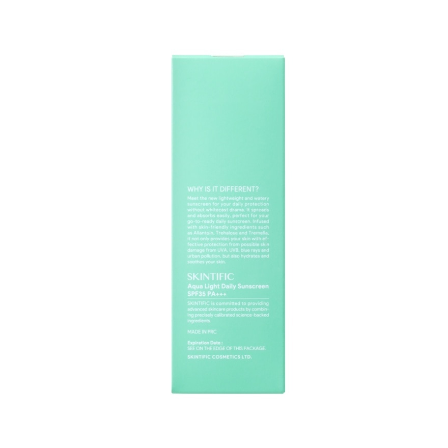 Skintific Aqua Light Daily Sunscreen SPF35 PA+++ Sun screen for acne skin. Meet the new lightweight and watery sunscreen for your daily protection without whitecast drama. It spreads and absorbs easily. Perfect for your go to ready daily sunscreen. Infused with skin friendly ingredients such as Allatoni, Trehalose and tremella, it not only provides youe skin with effective protection from possible skin damage from UVA, UVB, Blue rays and pollution, but also hydrates and soothes your skin.