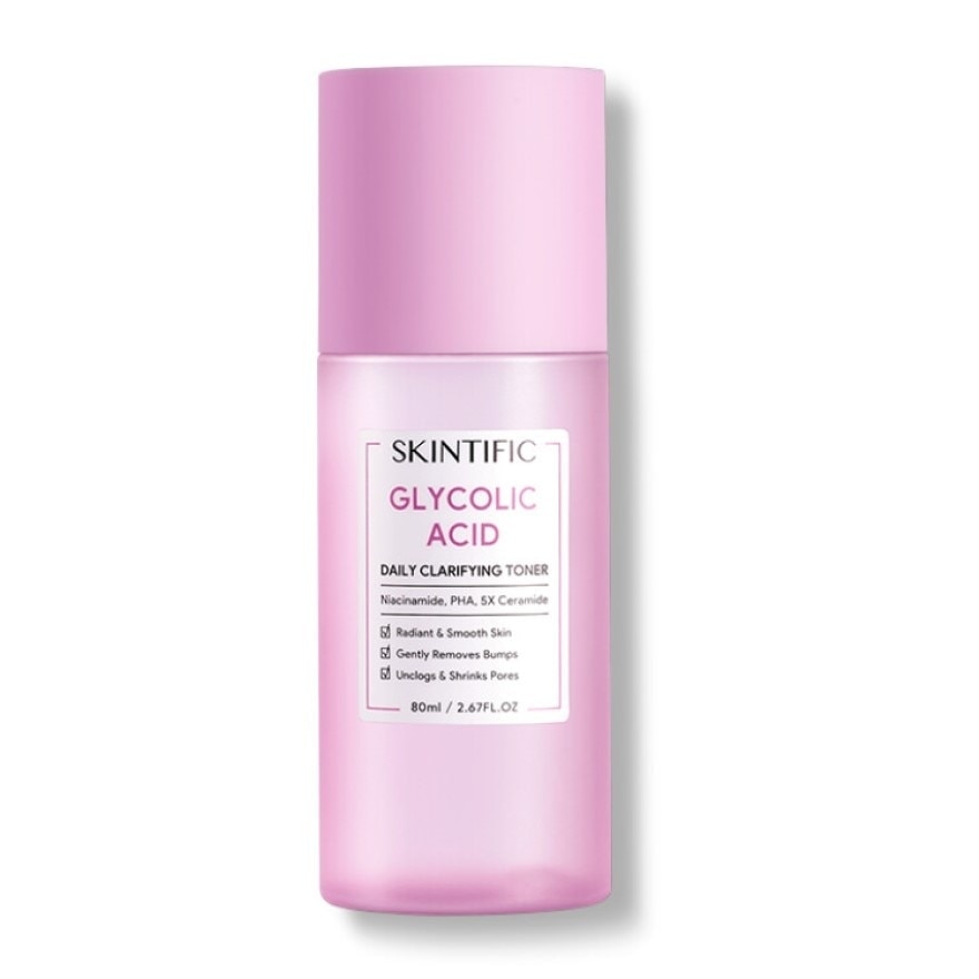 SKINTIFIC Glycolic Acid Daily Clarifying Toner Exfoliating toner that is safely formulated for daily use. Enriched with high-quality Glycolic Acid that not only helps reduces acne and breakouts but also helps brighten the skin. This toner is also enriched with Niacinamide and Lactobionic Acid reduces the visibility of the pores, smooths out the skin, and makes the skin look radiant. In addition, 5X Ceramide will protect and repair your skin barrier.