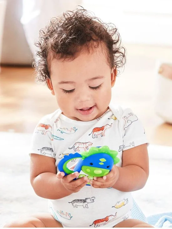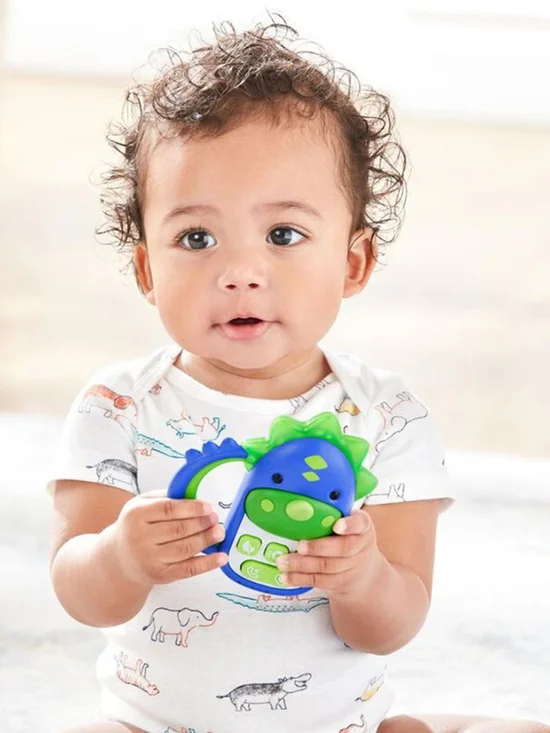 Talk about roarsome! This engaging dino phone keeps baby busy and happy with fun sounds, tunes and more from SKIPHOP. This cute and interesting toy phone for toddlers will meet their needs. They can use this telephone toy to pretend to call and chat with others. You can interact with children in education with this musical toy, then cultivate their imagination and communication skills. From the light-up horn to the easy-grip tail handle and pushbuttons, your little one will love to explore this fierce friend. Offers six sounds & melodies include a roar, chewing, hello and ring tone. Press nose to light-up dino’s spikes and press buttons for sounds and songs. Easy-grip handle. Helps develop fine motor skills. Made from safe quality materials and phthalate-free.
