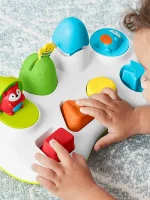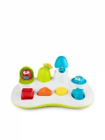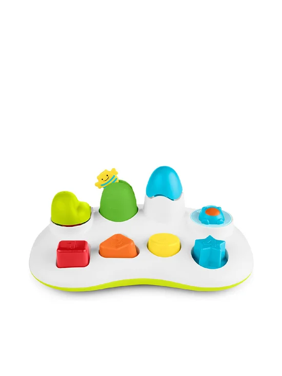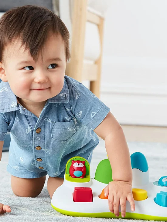 Pop Up Toy by SKIP HOP A playful intro to cause & effect, our colorful pop-up toy for baby is full of fun surprises, sounds and more for little hands to explore! Encourage fine motor skills and hand-eye coordination as baby presses, slides, toggles and turns the buttons to discover four cute action-packed friends including a peek-a-boo fox and a spinning hedgehog.