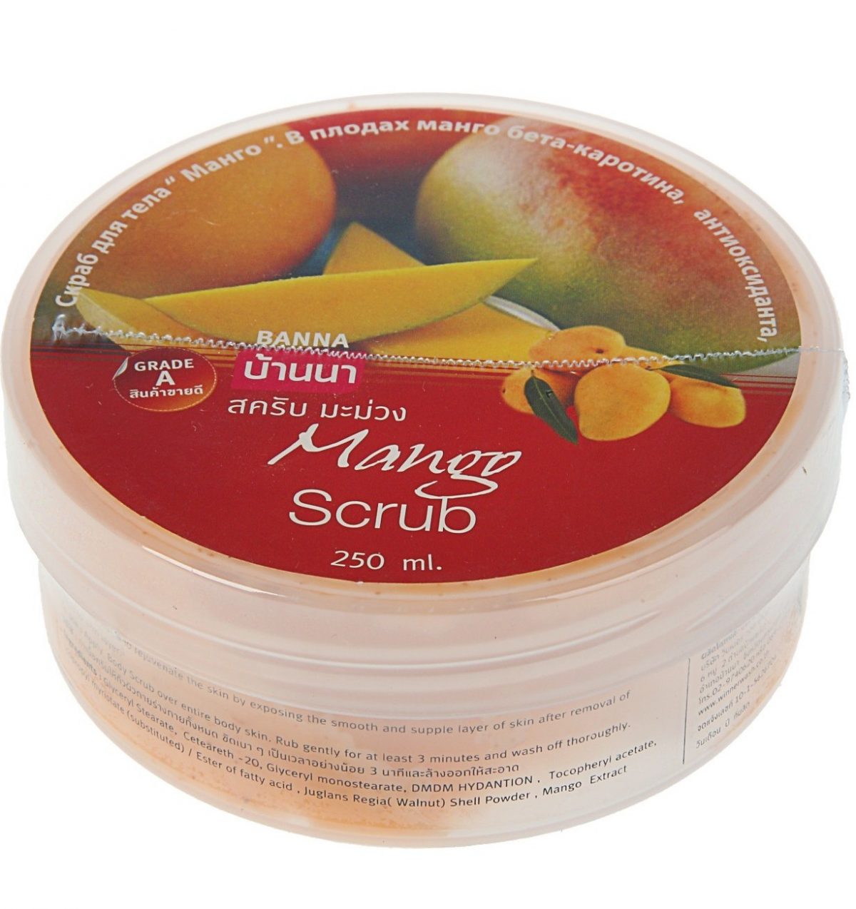 Скраб для тела Манго Banna Mango Scrub создан на основе мелкой кокосовой крошки и экстракта свежего, спелого, тропического Манго. Содержит в своем составе витамины А, В, С и множество других полезных компонентов. Скраб имеет легкую, нежную текстуру, бережно и эффективно удаляет отмершие клетки, обновляет и освежает кожу. Экстракт Манго легко проникает в клетки кожи, глубоко питает и великолепно увлажняет кожу, способствует сохранению водного баланса кожи. Активизирует обменные процессы, нормализует работу сальных желез, устраняет жирный блеск. Раскрывает поры, способствует глубокому очищению и сужению пор. Экстракт Манго обладает превосходными антиоксидантными и антисептическими свойствами, успокаивает кожу, устраняет различные покраснения и воспаления на коже, помогает избавиться от акне. Осветляет и выравнивает тон кожи, предотвращает чрезмерную выработку меланина, устраняет пигментацию.