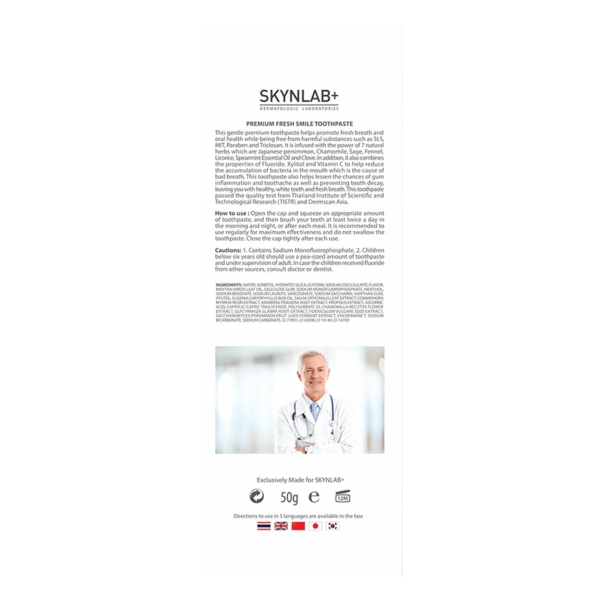 Skynlab Toothpaste Premium Fresh Smile This gentle premium toothpaste helps promote fresh breath and oral health while being free from harmful substances such as SLS MIT Paraben and Triclosan It is infused with the power of 7 natural herbs which are Japanese persimmon Chamomile Sage Fennel Licorice Spearmint Essential Oil and Clove In addition it also combines the properties of Fluoride Xylitol and Vitamin C to help reduce the accumulation of bacteria in the mouth which is the cause of bad breath This toothpaste also helps lessen the chances of gum inflammation and toothache as well as preventing tooth decay leaving you with healthy white teeth and fresh breath This toothpaste passed the quality test from Thailand Institute of Scientific and Technological Research and Dermscan Asia