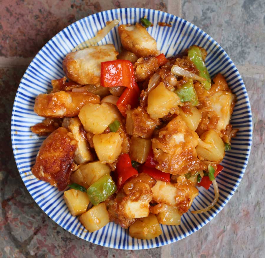 Разрезать ананас на кусочки, добавить в блюдо и томить с закрытой крышкой еще 5 минут.