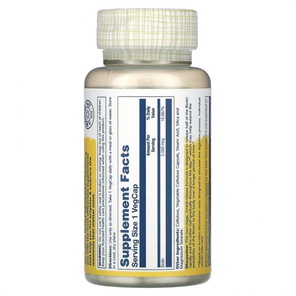 Комментарий: Биотин является важным витамином группы В и играет важную роль в поддержании здоровья волос, кожи и ногтей. Эта двухэтапная формула пролонгированного действия, благодаря которой первая половина биотина данного продукта высвобождается быстро, а другая постепенно в течение периода до 8 часов**, что может помочь увеличить доступность биотина для организма в течение более длительного периода времени.