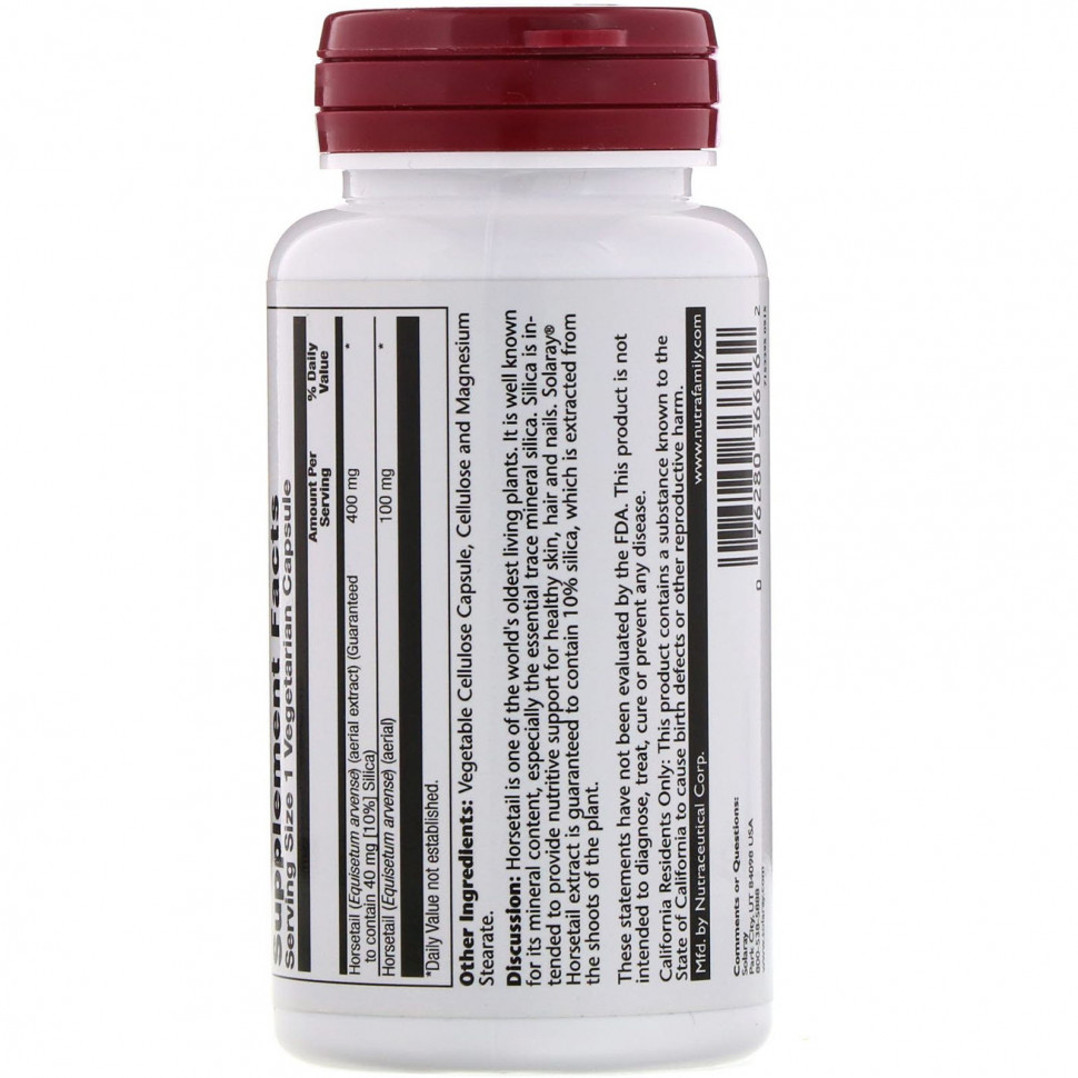 Описание. Хвощ — одно из древнейших живых растений в мире. Он хорошо известен своим минеральным содержанием, особенно важным микроэлементом диоксида кремния. Диоксид кремния обеспечивает питательную поддержку для здоровья кожи, волос и ногтей. Экстракт хвоща Solaray гарантированно содержит 10% диоксида кремния, который извлекается из побегов растения.