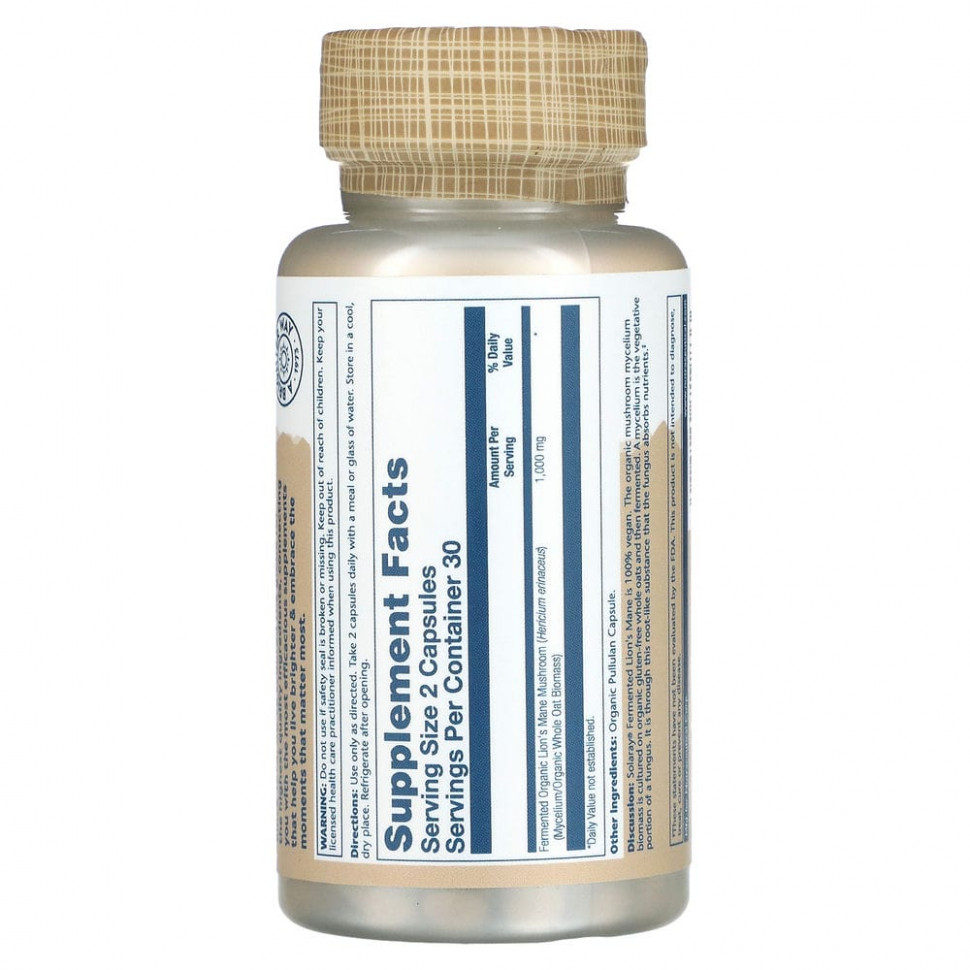 Ферментированный ежовик гребенчатый от Solaray® на 100% веганский, не содержит вспомогательных веществ, наполнителей или дополнительных ингредиентов. Биомассу мицелия органических грибов выращивают на органическом безглютеновом цельном овсе, а затем ферментируют. Мицелий — это вегетативное тело грибов. Именно благодаря этому веществу, похожему на корень, гриб усваивает питательные вещества.