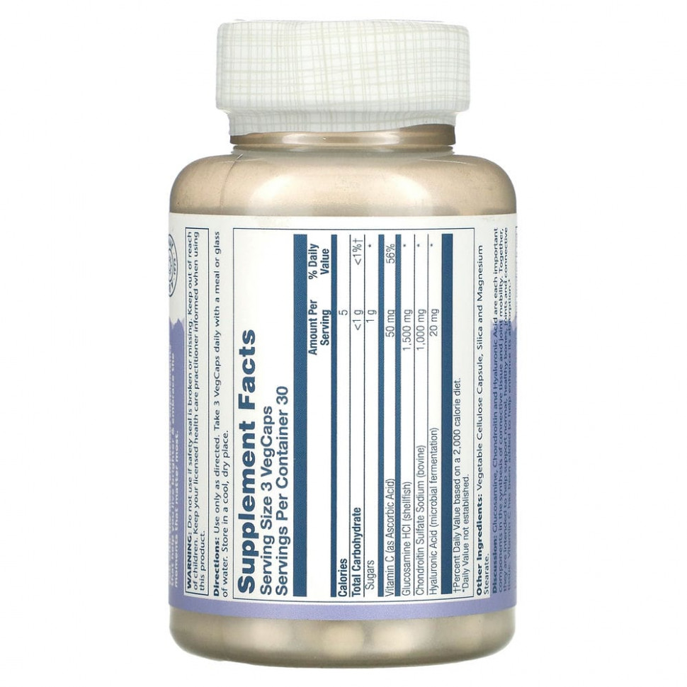 Описание. Глюкозамин, хондроитин и гиалуроновая кислота являются важными составляющими, которые влияют на синтез соединительной ткани и подвижность суставов. Вместе они предназначены для поддержки нормальных, здоровых костей, суставов и соединительной ткани. Витамин C был добавлен, чтобы улучшить их усвоение.