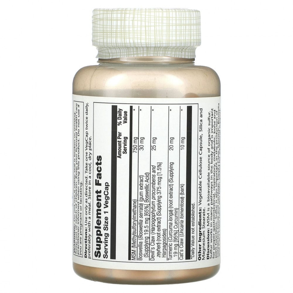 Описание. Метилсульфонилметан (МСМ) — это биодоступный источник органической серы. Сера имеет множество функций в организме и важна для нормальной работы желудочно-кишечного тракта, дыхательной системы, обмена веществ, костей и суставов. Кроме того, сера играет важную роль в образовании соединительной ткани и хрящей. Дьявольский коготь, куркума, босвеллия и кошачий коготь обеспечивают дополнительную поддержку.