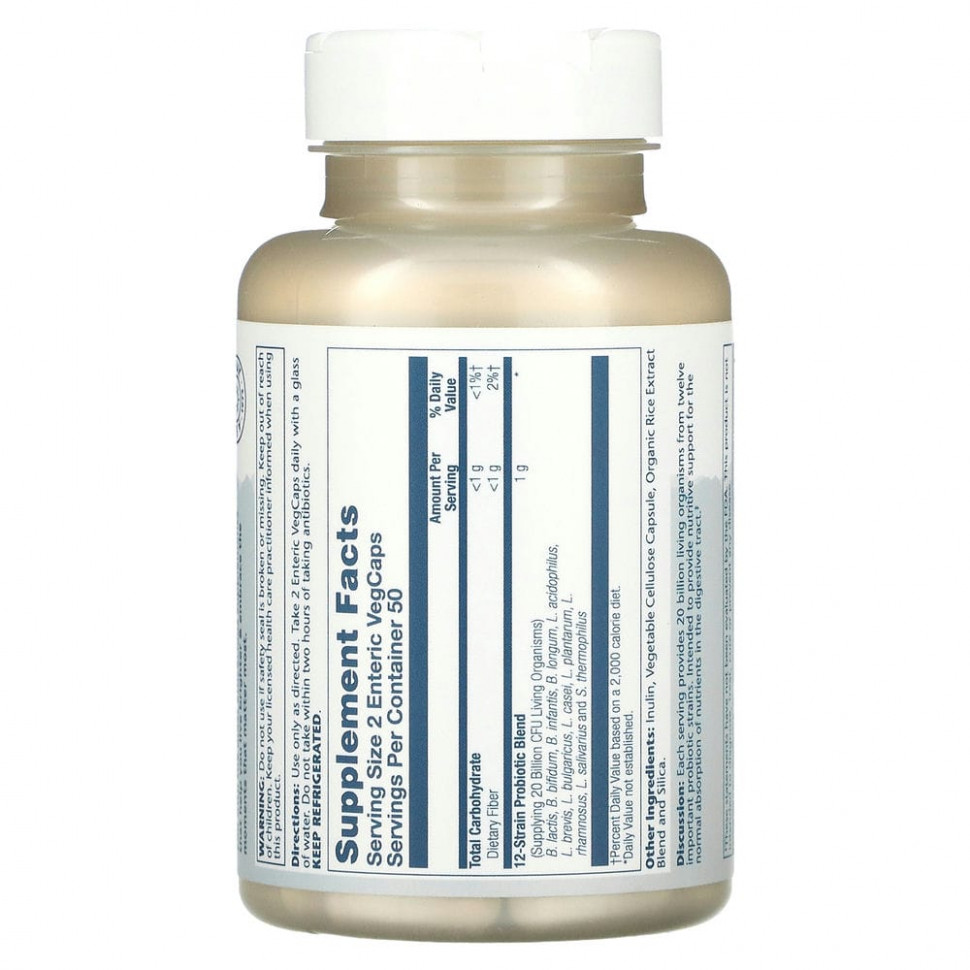 В каждой порции содержится 20 миллиардов** живых организмов из двенадцати важных пробиотических штаммов. Предназначены для предоставления питательной поддержки для нормального усваивания питательных веществ в пищеварительном тракте. Для максимального увеличения выживаемости микроорганизмов каждая растительная капсула покрыта кишечнорастворимой оболочкой.