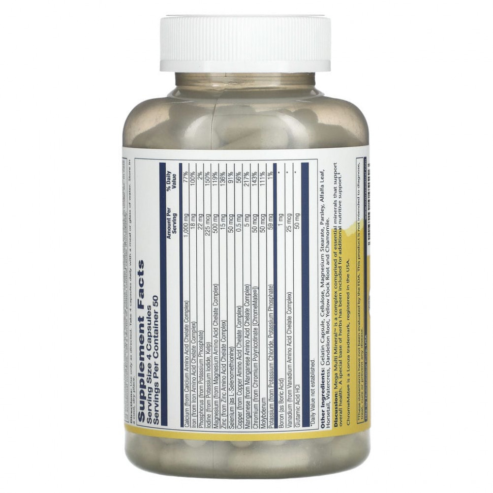 Комментарий. Mega Multi Mineral — это сложный минеральный комплекс, состоящий из незаменимых минералов, которые способствуют поддержанию общего состояния здоровья. Минералы, содержащиеся в этом продукте, взаимодействуют с аспарагиновой кислотой, концентратом цельного риса, лимонной кислотой и глицином для создания хелатного комплекса с повышенной усвояемостью. Для дополнительной питательной поддержки в состав продукта также добавлена специальная растительная основа.