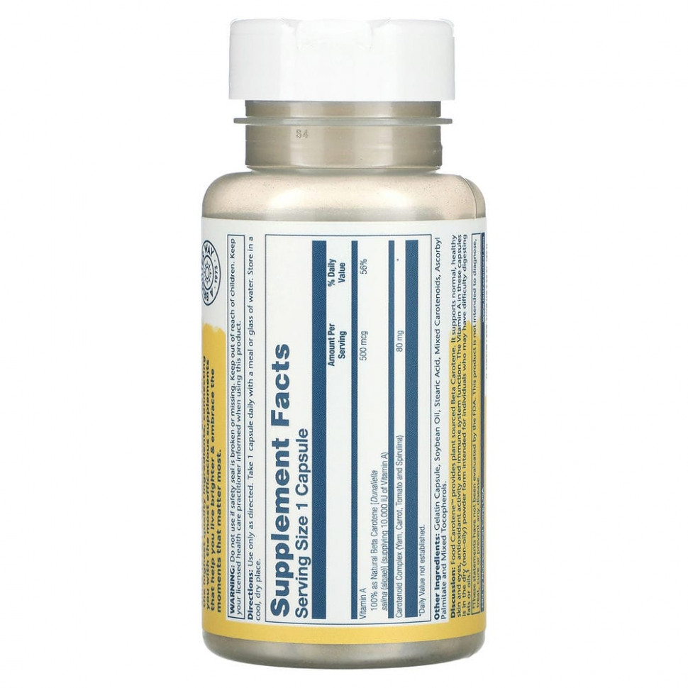 Комментарий. В состав Food Carotene™ входит бета-каротин растительного происхождения. Одна порция содержит 10 000 МЕ витамина А в виде бета-каротина, альфа-каротина и других каротиноидов (криптоксантина, зеаксантина и лютеина). Они оказывают положительное влияние на здоровье кожи и глаз, на антиоксидантную активность и работу иммунной системы. Витамин А в этих капсулах находится в форме сухого (немасляного) порошка. Такая форма была создана специально для людей, которые могут испытывать трудности с перевариванием жиров или масел.