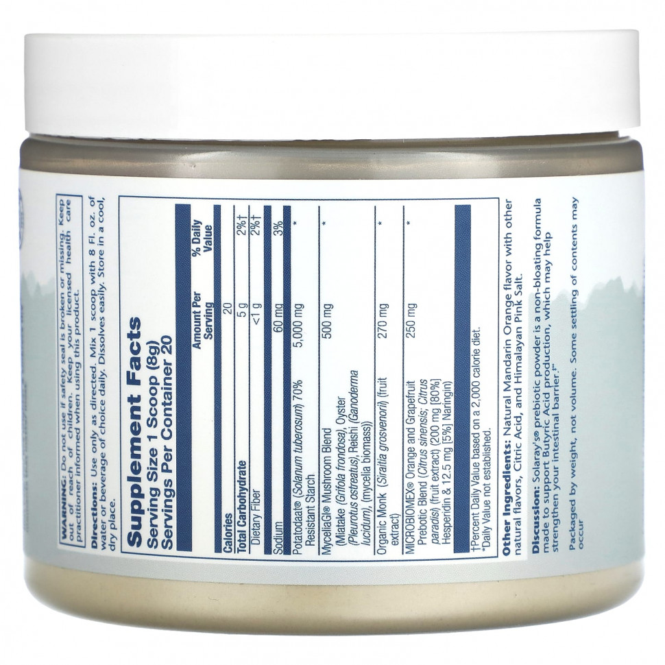 Описание. Пребиотический порошок Solaray’s® не вызывает вздутия живота и поддерживает выработку масляной кислоты, которая может способствовать укреплению кишечного барьера **.
