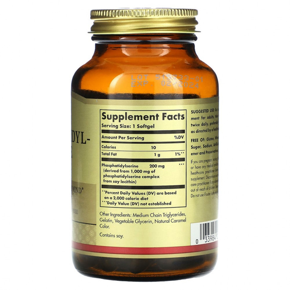 Фосфатидилсерин от Solgar в дозировке 200 мг является добавкой премиум качества для поддержания памяти и изготовляется из чистого и натурального сырья. С возрастом уровни фосфатидилсерина в мозге могут снижаться, поэтому для поддержания работы мозга, повышения умственной концентрации и улучшения памяти очень важно их ежедневно восполнять.