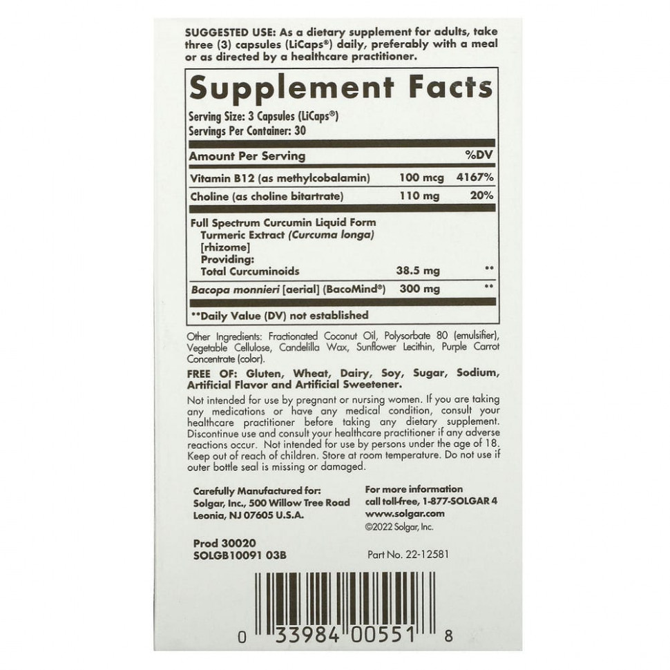 Теперь Solgar® Full Spectrum Brain Works сочетает в себе силу куркумина полного спектра действия с бакопой (Bacomind®), холином и витамином B12 для лучшего поддержания умственного здоровья и когнитивной функции. Solgar® соединил вместе порошки традиционно используемых в медицине трав и современную науку в уникальном продукте, который сочетает в себе: