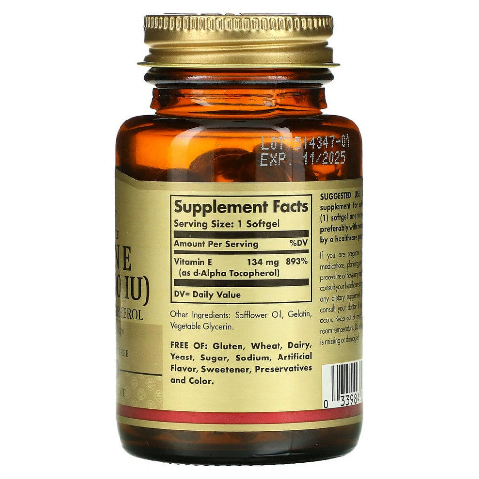 Витамин E — необходимый организму жирорастворимый антиоксидант. Он обеспечивает поддержку иммунной системы и помогает бороться с повреждающими клетки свободными радикалами, которые вызывают окислительные процессы в организме, что может привести к преждевременному старению клеток. Данный препарат содержит натуральный витамин Е в виде чистого d-альфа токоферола. Он выпускается в форме наполненных жидкостью мягких таблеток для оптимального усвоения и растворения.