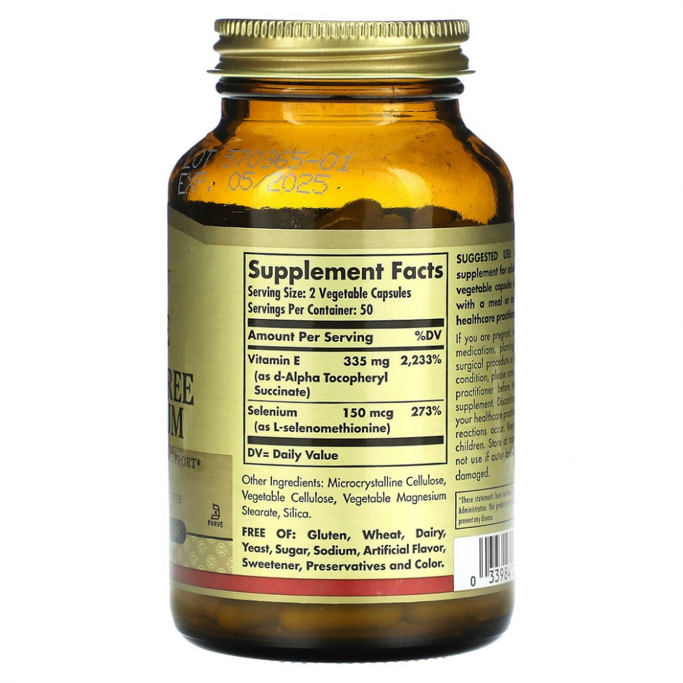 Формула содержит натуральный витамин E в сухой (безмасляной) форме, подходит для тех, кому сложно переваривать масла и жиры. Содержит важный для здоровья микроэлемент селен. Как компонент антиоксидантного фермента, глутатионпероксидазы, селен борется с вредными для клеток свободными радикалами. Он освобождает витамин E, который, в свою очередь, поддерживает антиоксидантную защитную систему организма. Эта синергетическая антиоксидантная формула представлена в форме двойных вегетарианских капсул для удобства приема.
