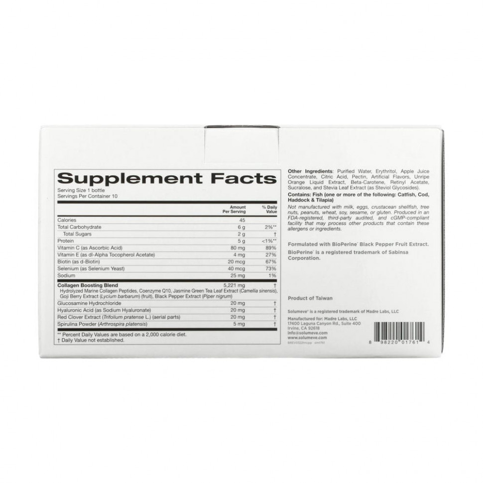 В этих удобных флаконах содержится Copitmal®, смесь из пептидов гидролизованного морского коллагена и растительных экстрактов для усиления действия коллагена, а также коэнзим CoQ10 и BioPerine® для повышения биологической доступности. Гиалуроновая кислота и глюкозамин в составе помогают удерживать влагу в коже, а витамин C способствует синтезу коллагена и обеспечивает антиоксидантную защиту*.
