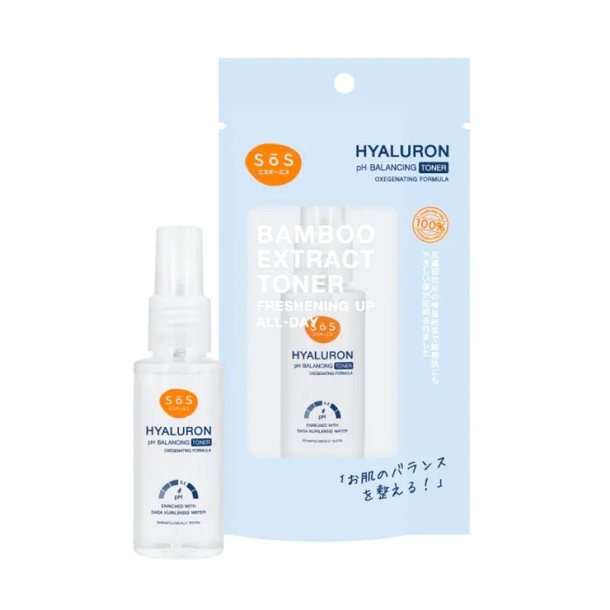 SoS Hyaluron pH Balancing Toner Mist (ADD SPRAY) Gentle to the sensitive skin. It helps to balance all skin that has lost moisture and pH level from cleansing. Reduces irritation, acne breakouts while adding oxygen to the skin immediately, the skin is moisturized, clean, soft and ready for the moisturizing step. SASA KURILENSIS WATER — bamboo water from Aomori Japan increases moisture, soothes skin, and reduces irritation. It also helps reduce acne-causing bacteria and oiliness on the skin and exfoliates the dead cells. Six essential minerals for the skin — help bring skin nutrients deeply absorb into the skin effectively. It also helps to add oxygen into the skin, which makes skin cells work better and repair themselves. It stimulates the collagen and elastin production process and fights free radicals. Skin looks firmer and smoother. — Hyaluron helps to retain water and increase moisture to the skin. Help reduce wrinkles and smoothen skin. — Beta Glucan — a moisture retention agent that works with sodium hyaluronate to help reduce irritation and inflammation. Strengthen skin and helps the exfoliation process while stimulating collagen and elastin production, reducing wrinkles, antioxidants, and healing acne. — Purslane — an antioxidant that helps protect the skin from UV rays, reduce irritation and inflammation, increase skin moisture and fight free radicals. Skin becomes more radiant, firmer, and smoother.Sos