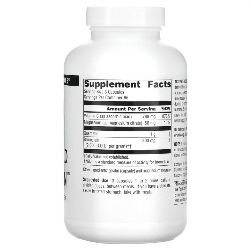 Активированный кверцетин — это уникальный биофлавоноид, полученный из растительных источников. В результате исследований культур клеток человека было обнаружено, что кверцетин препятствует высвобождению гистамина. Для того, чтобы подтвердить действие кверцитина на людей, если оно наблюдается, необходимо провести дополнительные исследования. Бромелайн — это фермент из ананаса, который помогает организму во время стресса, а витамин С способствует укреплению иммунитета.