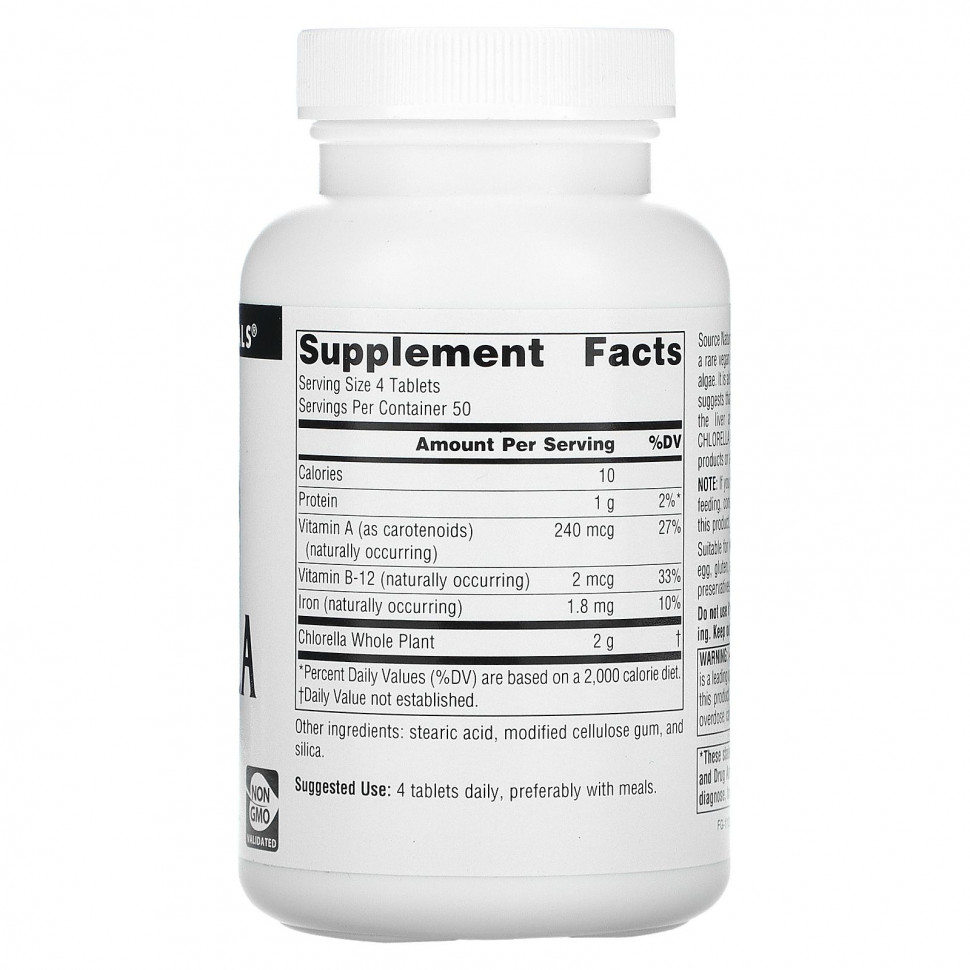 Хлорелла Source Naturals — это полноценный протеин, а также редкий веганский источник витамина B12 из чистых 100% водорослей. Это также хороший источник железа и витамина А. Исследования показывают, что хлорелла также способна поддерживать здоровье печени и иммунной системы. Хлорелла Source Naturals не содержит ГМО и не содержит продуктов животного происхождения.