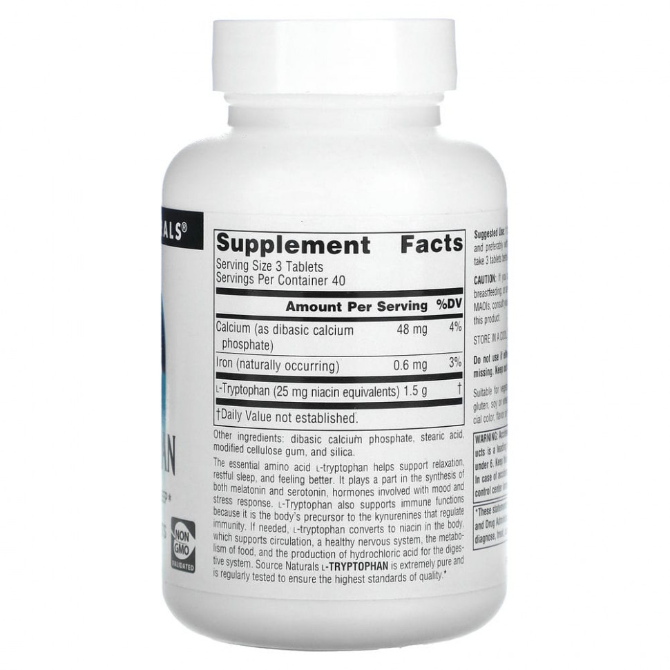 Незаменимая аминокислота L-триптофан способствует расслаблению, полноценному сну и улучшению самочувствия. Она участвует в синтезе мелатонина и серотонина — гормонов, отвечающих за настроение и реакцию на стресс. L-триптофан также поддерживает иммунную функцию, поскольку является прекурсором кинуренинов, регуляторов иммунитета. При необходимости L-триптофан в организме превращается в ниацин, который поддерживает кровообращение, здоровье нервной системы, метаболизм пищи и выработку соляной кислоты для пищеварения. L-триптофан Source Naturals чрезвычайно чистый и регулярно тестируется для соответствия высочайшим стандартам качества.
