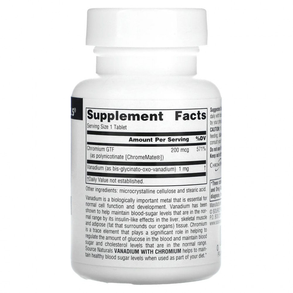 Ванадий представляет собой биологически важный металл, необходимый для нормального функционирования и развития клеток. Ванадий помогает поддерживать нормальный уровень сахара в крови, действуя подобно инсулину в печени, скелетных мышцах и жировых тканях. Хром — это микроэлемент, который играет важную роль в регулировании уровня глюкозы в крови и поддержании уровня сахара и холестерина. Ванадий с хромом от Source Naturals помогает поддерживать нормальный уровень сахара в крови при условии применения на фоне здорового питания.