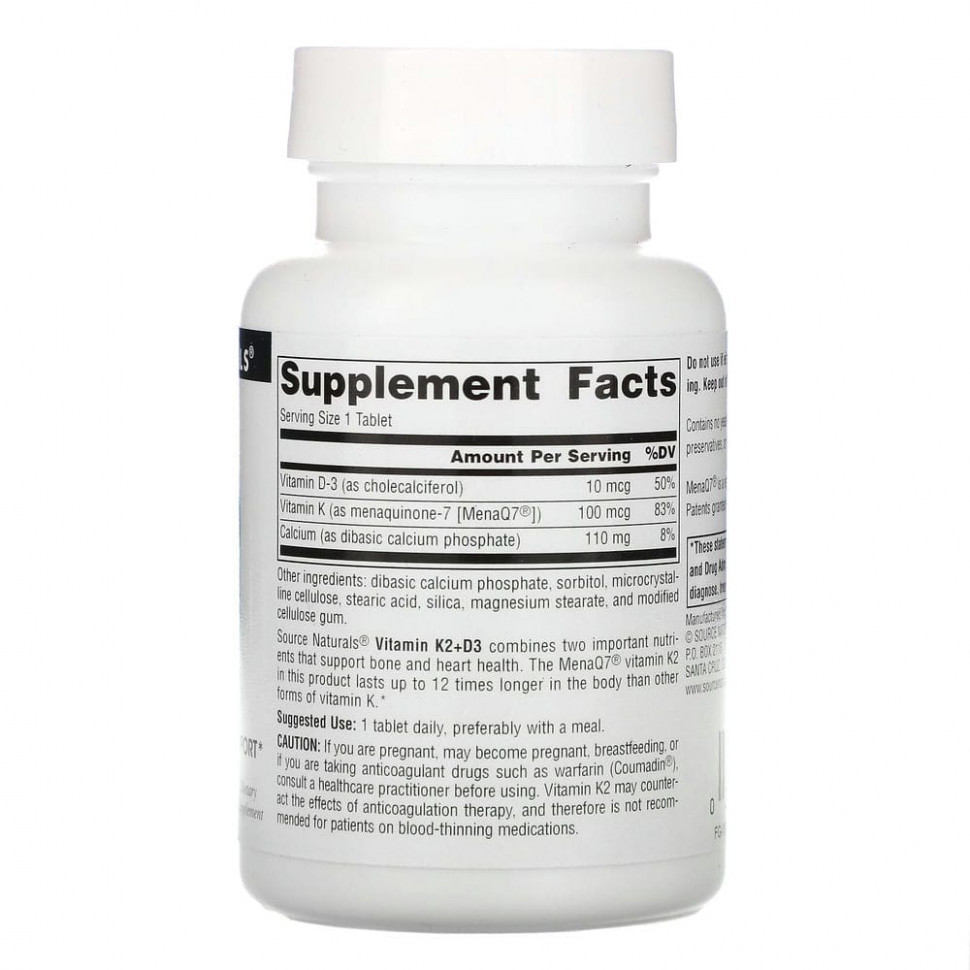 Source Naturals® с витаминами K2 и D3 объединяет два важных питательных вещества, поддерживающих здоровье костей и сердца. Витамин К2 из MeaQ7® сохраняется в организме в 12 раз дольше, чем другие формы витамина К.
