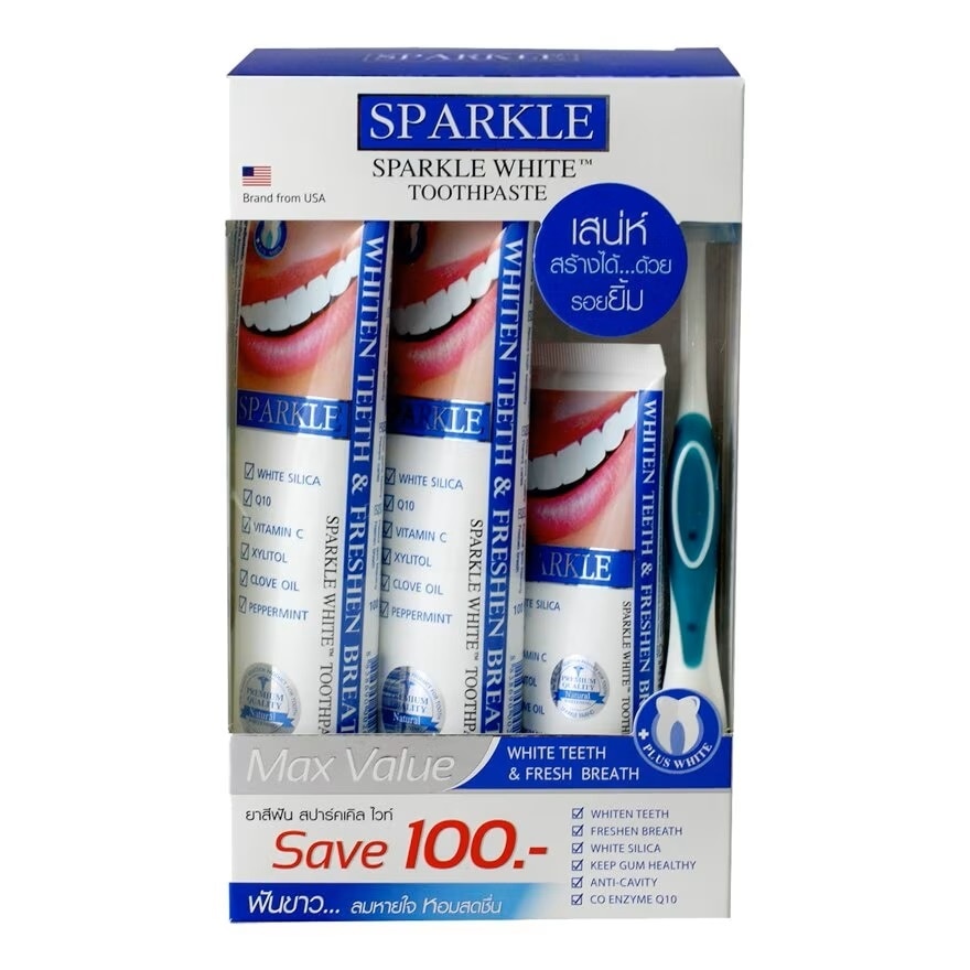 Sparkle White Fresh Toothpaste Whiten your Teeth and keep Fresh Breath WHITE SILICA : with diminutive molecule of white silica that helps remove plaque without destroy enamel andwhiten your teeth. CLOVE OIL : anti bacteria build-upwhich causes smell breath and decreases oral inflammation. POTASSIUM NITRATE : relieve hypersensitivity teeth feeling. Sparkle white fresh toothpaste Whiten your Teeth and keep Fresh Breath WHITE SILICA : with diminutive molecule of white silica that helps remove plaque without destroy enamel andwhiten your teeth. CLOVE OIL : anti bacteria build-upwhich causes smell breath and decreases oral inflammation. POTASSIUM NITRATE : relieve hypersensitivity teeth feeling.