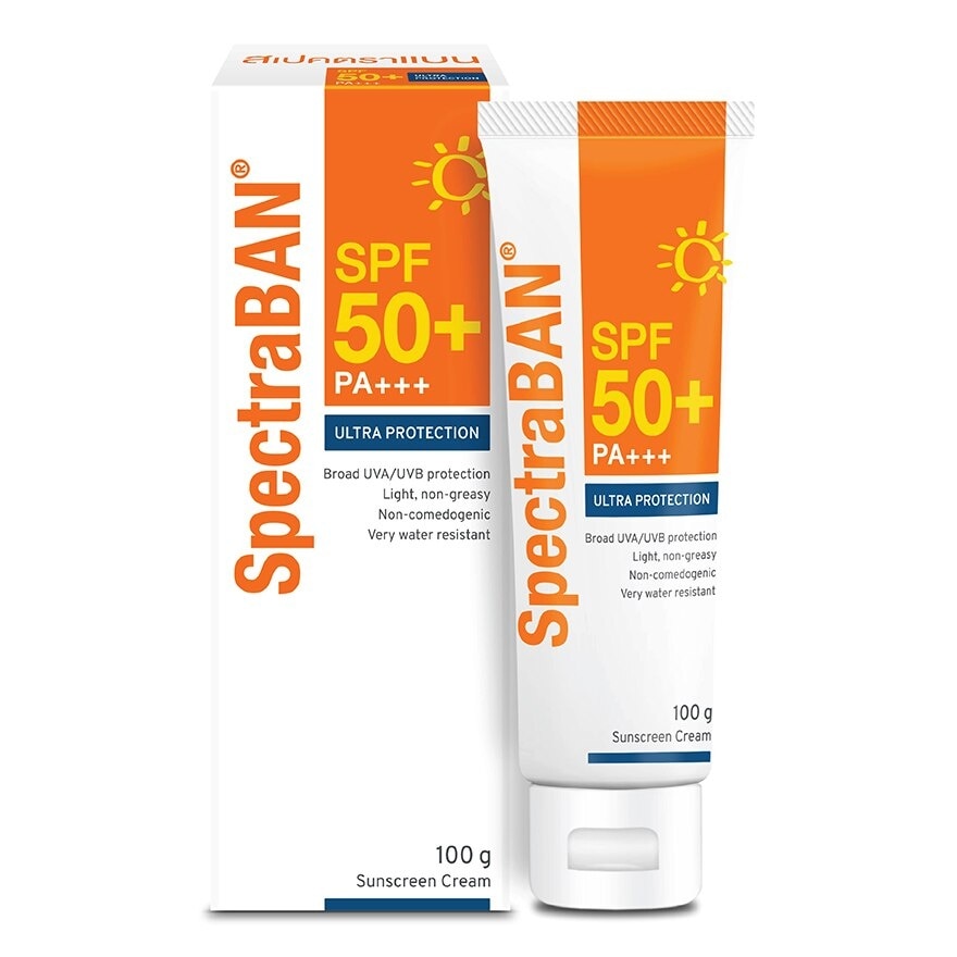 SpectraBAN SPF 50+ PA+++ ULTRA PROTECTION Broad UVA/UVB protection, Light, non-greasy, Non-comedogenic, Very water resistant, Sunscreen for face and body, Protect skin from UVA/ UVB rays with SPF 50+ /PA+++High protection against UVA rays, cause of photoaging, and UVB rays, cause of skin darkening, dark spots, and blemish. Contains vitamin E, an antioxidant, which helps to prevent fine lines.Light texture. Quick absorption. Non-greasy. Suitable for daily use. — Non-comedogenic. — Hypoallergenic — Free from fragrance, preservatives, and paraben — Water and sweat resistant