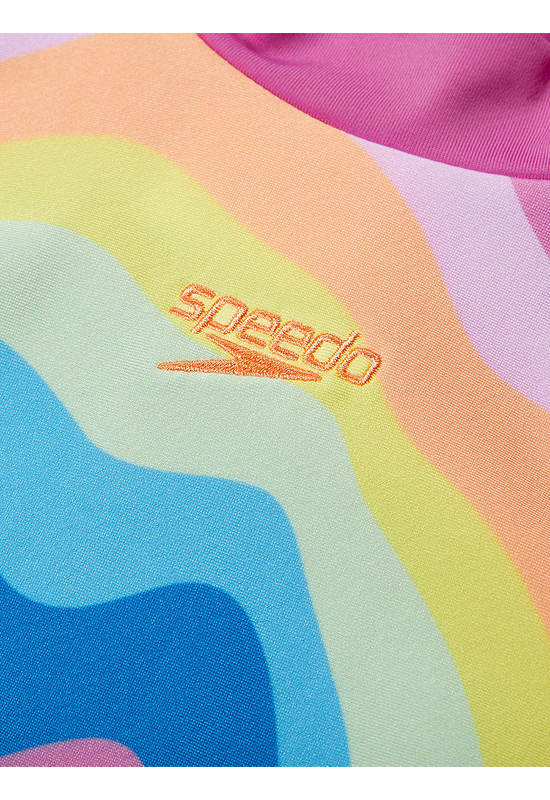Radiate positivity wearing this vibrant SPEEDO Printed Long Sleeve Girls Rashguard, featuring high-vibe colours and a colorful design. The comfy pull-on rash top includes UPF40+ for sun protection in and out of the water. Taking young swimmers from beach to pool, our EnduraBrite fabric offers higher chlorine resistance than standard swimwear fabrics, delivers superb colour performance and fits like new for longer with CREORA® HighClo™. Made in part from recycled plastic bottles — the polyester yarn in the EnduraBrite fabric is made from 100% post-consumer waste.