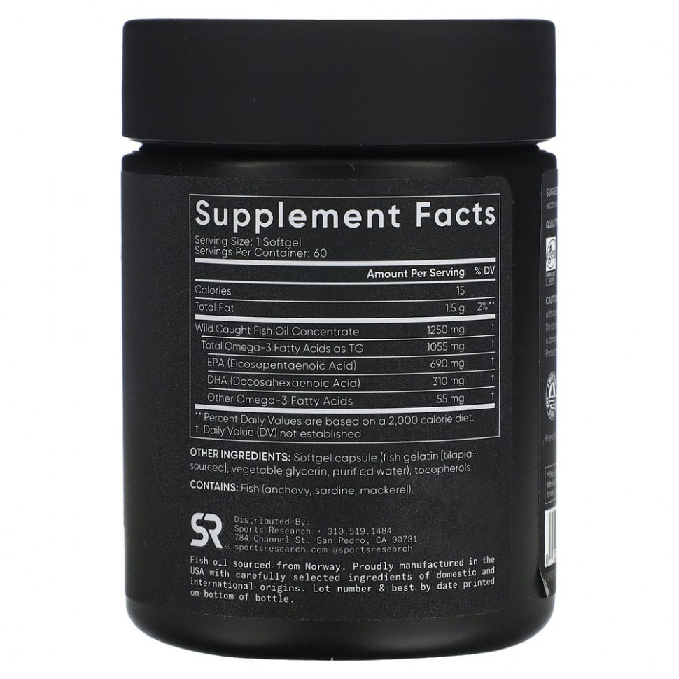 Рыбий жир SR Omega-3 содержит сверхконцентрированный уровень ЭПК & ДГК (995 мг) в каждой капсуле получают из рыбы, выловленной в дикой природе, с использованием усовершенствованной молекулярной дистилляции. & процессы очистки.