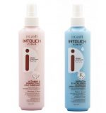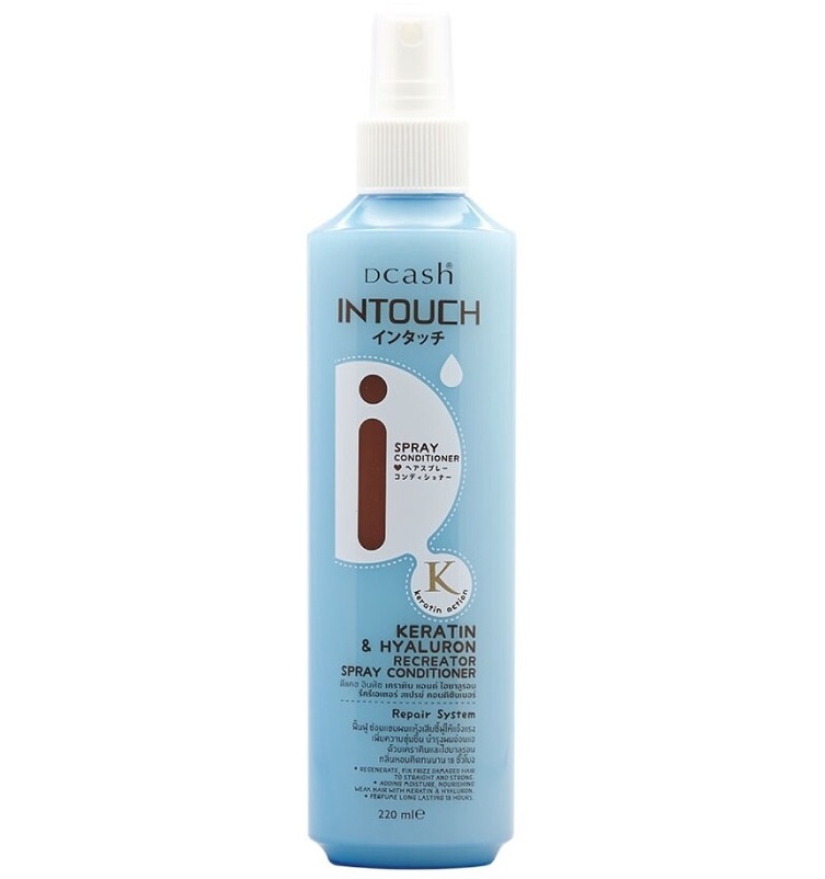 Спрей — кондиционер Dcash Intouch с 18-часовым ароматом омолаживает сухую, шелушащуюся поверхность волос с кератином и гиалуроном (голубой).