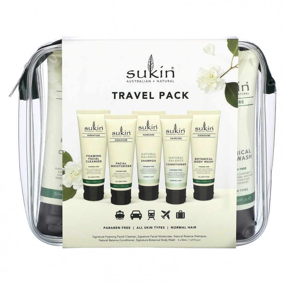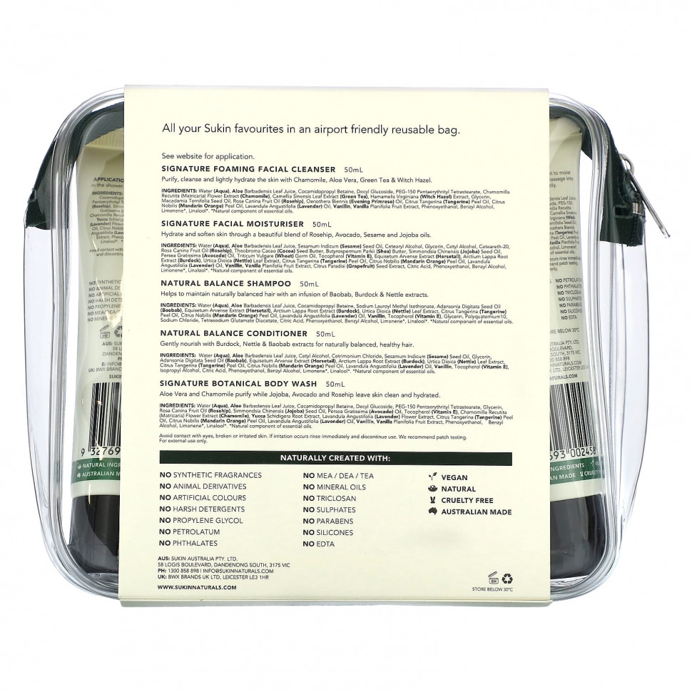 Все любимые товары от Sukin в многоразовой сумке, удобной для использования в аэропортах.