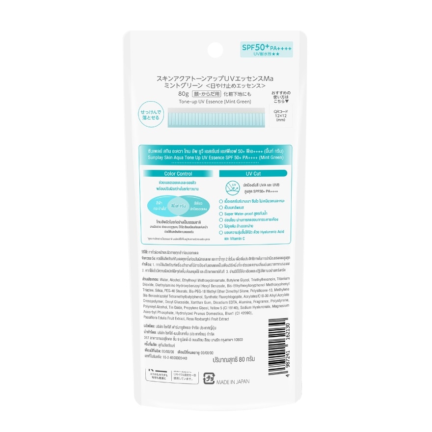 The new formula of Tone Up UV Essence (Mint Green) is a color correctting sunscreen helps tone up skin clarity instantly and helps covering redness and acne scars. Plus oil control benefit!-Essence with Mint Green color helps brigthen skin looking and covring redness and acne scars.-With Sparking pearl helps illuminise and glowing-looking skin on day light-Moisturize by Hyaluronic acid and Vitamin C -Fresh scent stimulate your heart beats-Non-sticky, Light weight and easily washed by soap-Gentle formula. Free of mineral oil and Paraben-Super waterproof.