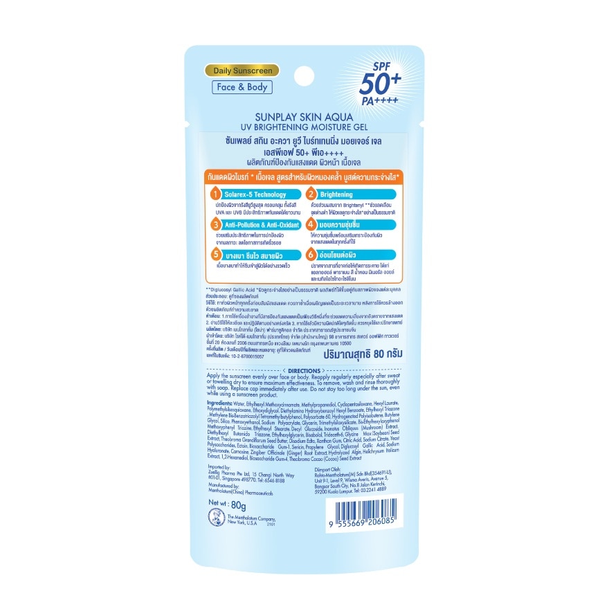 Sunplay Skin Aqua UV BRIGHTENING MOISTURE GEL SPF50+ PA++++ Gel sunscreen , brightening formula for boosting skin radiance and protecting youthful skin. 1. Advanced UV Protection with Solarex-5 Technology Developed by Rohto-Mentholatumthis. Technology provides Broad Spectrum protection against UVA and UVB rays. Reduces the impact of Blue Light with SPF50+ PA++++ for comprehensive sun defense while nourishing the skin. 2. Brightening and Anti-Aging Power. Brighten your skin with Brightening Microbiome Technology and a superior active ingredient that delivers up to 4x the brightening power of Vitamin C, effectively reducing dark spots and age-related marks. Anti-Aging & Anti-Pollution benefits protect your skin from environmental stressors, helping to minimize wrinkles and signs of aging. 3. Long-Lasting Hydration for Plump, Dewy Skin. Enriched with Hyaluronic Acid (HYA) to deeply hydrate and lock in moisture, leaving your skin plump, fresh, and radiant. Soft-Gel Texture : Ultra-light, water-like gel that absorbs quickly, leaving your skin feeling fresh, non-sticky, and comfortable. Gentle formula on Skin free from fragrance, colorants, parabens, and mineral oils. Waterproof & Sweat-Resistant: Perfect for active, everyday use.