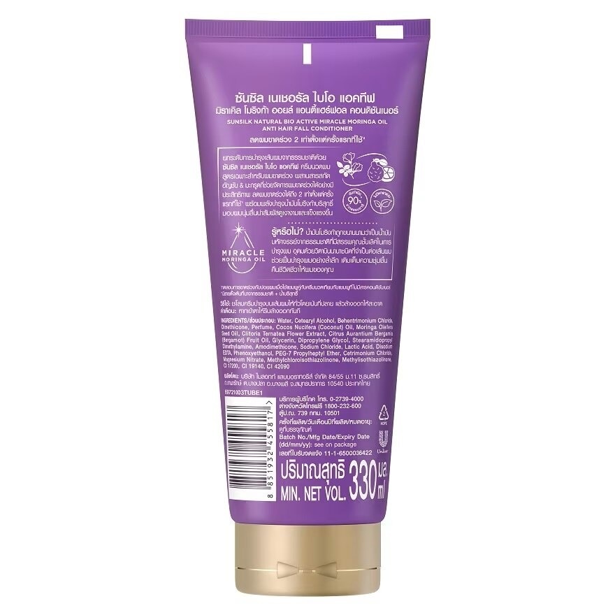 Sunsilk Natural Conditioner Bio Active Bergamot & Butterflypea Anti Hair Fall Uplift Your Natural Hair Nourishment With Sunsilk Natural Bio Active, The Dedicate Formulation For Hairr Fall With The Extract From Butterfly Pea And Bergamot Which Can Effectively Reduce Hair Fall, Reduce Hair Fall Upto 2 Times Since The First Use And Thickening Your Hair.Combining With Virgin Moringa Oil Which Is Full Source Of Vitamin And Essentials Foods For Hair So Your Hair Is Visibly Strongher & Healthier. Sunsilk Natural Bio Active Bergamot & Butterflypea Anti Hair Fall Conditioner The New era of High efficacy natural products with Moringa oil to give visibly healthier & shinier hair and reducing hair fall upto 2 times from the first use 90% Natural Origin , Free from paraben