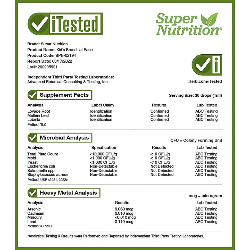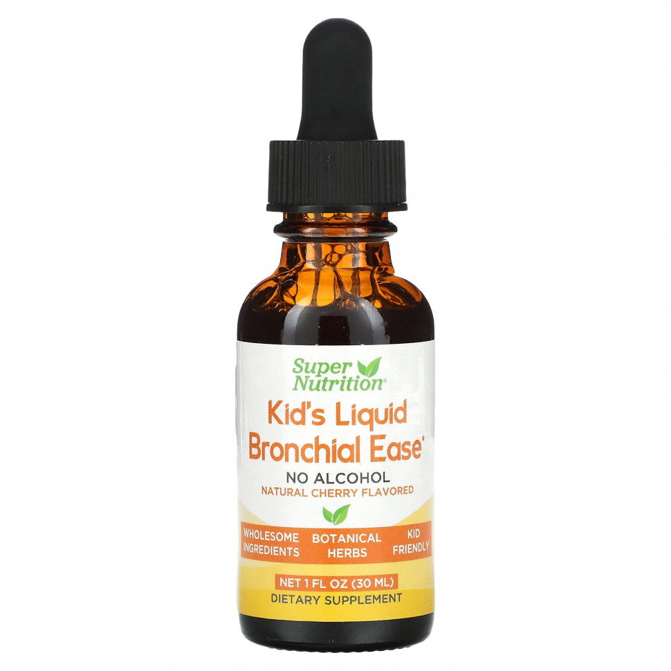 Kid’s Bronchial Ease от Super Nutrition содержит синергетическую смесь экстрактов трав в добавке в удобной жидкой форме. Добавка имеет вкус натуральной вишни, что делает ее интересным и вкусным способом поддержать здоровье детей при плохом самочувствии. Добавка подходит для вегетарианцев и веганов, а также не содержит глютена, ГМО, сои и спирта.