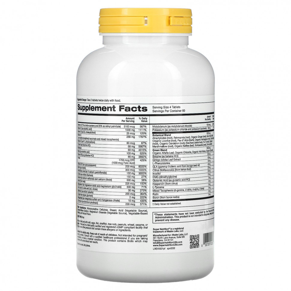 Мультивитамины помогают поддерживать здоровый образ жизни, обеспечивая организм многими необходимыми витаминами и минералами. Наши высокоэффективные мультивитамины содержат 24 витамина и минерала, в том числе витамины A, C, D, E и B6, а также такие минералы, как кальций, цинк, биотин и магний. Эта добавка также содержит смесь мощной суперзелени, такой как гинкго билоба, листья люцерны и ирландский мох, а также растения — имбирь, солодку и крапиву. Наша уникальная формула была разработана для поддержки здоровья костей и выработки энергии, а также чтобы помочь вам вести здоровый образ жизни*.