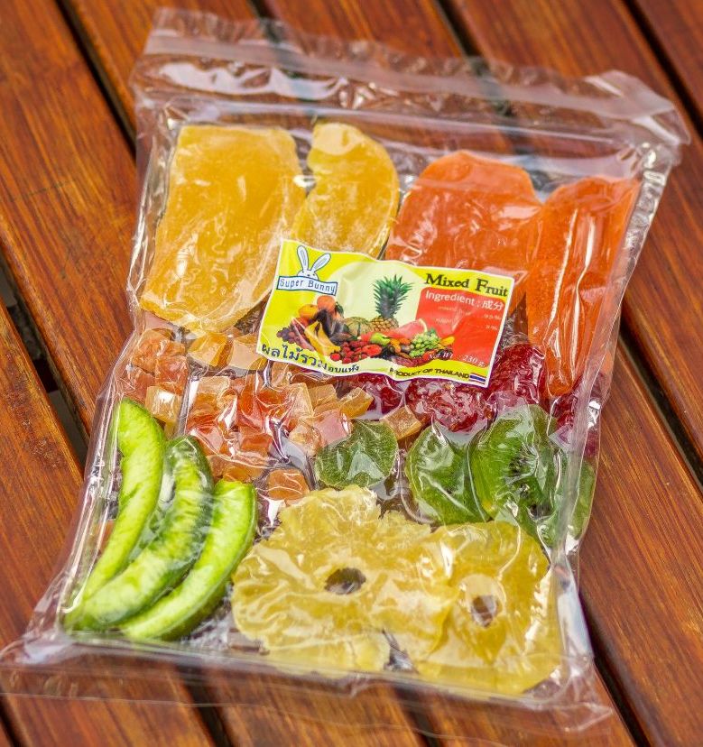 Вкуснейшие тайские манго, киви, папайя и ананасы были нарезаны кусочками, высушены и герметически упакованы, чтобы надолго сохранить оригинальный фруктовый вкус и аромат. Поскольку сахара используется совсем незначительное количество, а фруктоза ничем не уступает ему в сладости, но гораздо меньше способствует формированию жировых отложений, подобные продукты — лучший десерт. К тому же в нем сохраняются витамины и минералы.
