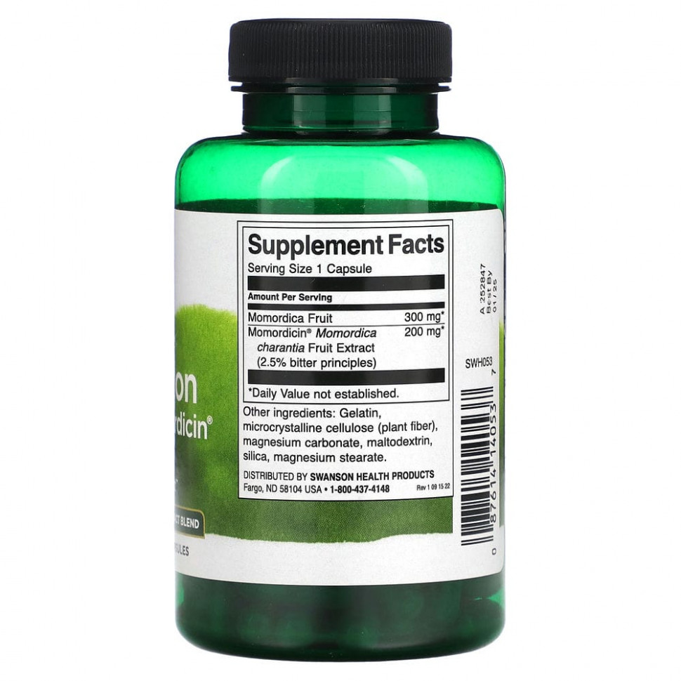 Добавка Swanson Momordica поможет вашему организму поддержать нормальный метаболизм глюкозы. Это азиатское растение, также известное как горькая дыня, на протяжении сотен лет используется в аюрведической традиции для поддержания здорового обмена веществ. Наши удобные капсулы содержат 200 мг экстракта момордики с гарантированной эффективностью (стандартизированный до 2,5% горечи) и 300 мг сушеных плодов момордики.