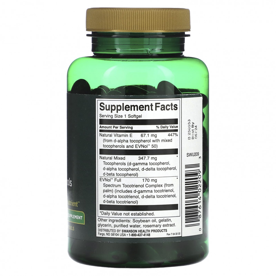 Swanson Full Spectrum E с токотриенолами — это полноценная добавка витамина E. Антиоксидантная защита этой формулы помогает защитить ваши клетки от разрушительного воздействия свободных радикалов. Каждая мягкая таблетка с высокой биодоступностью содержит 100 МЕ витамина E из d-альфа-токоферола, а также полный спектр других токоферолов, включая самую высокую концентрацию d-гамма-токоферола, а также синергетическую поддержку комплекса токотриенолов полного спектра. Эти близкие родственники токоферолов действуют как мощные антиоксиданты, которые оптимизируют активность витамина Е по нейтрализации свободных радикалов для поддержания здоровья сердечно-сосудистой системы, здоровья клеток и многого другого.
