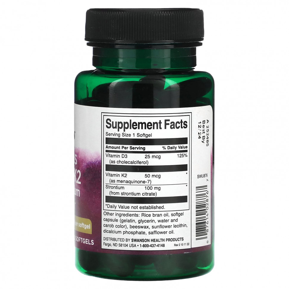 Swanson Strontium Complex — это то, что вам нужно для серьезного питания для укрепления костей. По химическому составу похож на кальций, микроэлемент стронций играет важную роль в формировании костей, помогая поддерживать здоровую минеральную плотность костей. Но если вы не едите много морепродуктов каждый день, вы, вероятно, не получите их много в своем рационе. Наши мягкие таблетки комплекса стронция содержат 100 мг стронция из цитрата стронция с высокой биодоступностью, обогащенного большим количеством витаминов D3 и K2 для обеспечения оптимального усвоения. Хотя витамин K в основном известен своим участием в свертывании крови, K2 также помогает активировать белки, которые регулируют попадание кальция в организм. Это идеальный способ дополнить ваш ежедневный режим питания для поддержания здоровья костей.