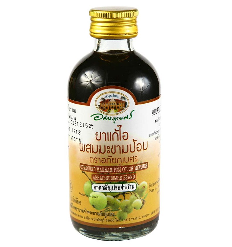 Тайская микстура от кашля, приготовленная на основе растения эмблики, применяется при кашле сухом и мокром, простуде легкой и не очень, бронхите начальном и хроническом. Помогает курильщикам при характерном кашле. Облегчает состояние больного бронхиальной астмой.