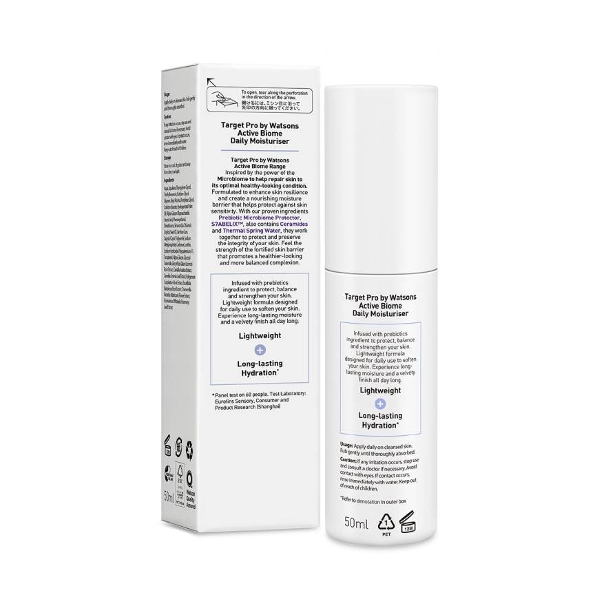 Target Pro by Watsons Active Biome Daily Moisturiser 50ml Infused with prebiotics ingredients to protect, balance and strengthen your skin. Lightweight formula designed for daily use to soften your skin. Experience long lasting* moisture and a velvety finish all day long. *Panel test on 60 people. Test Laboratory; Eurofins Sensory, Consumer and Product Research (Shanghai). The paper used in this packaging is certified by FSC.