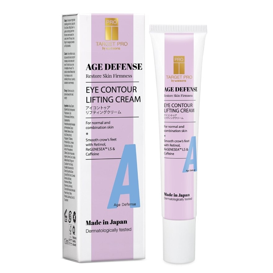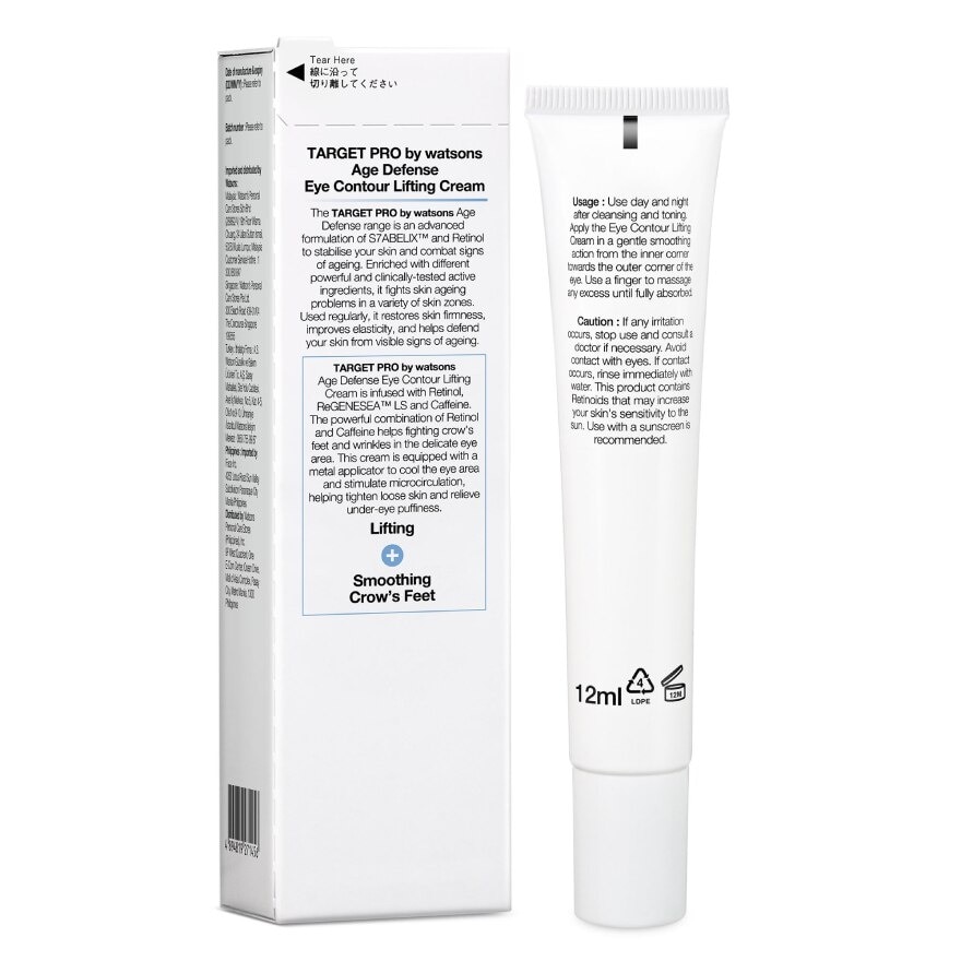 Target Pro by Watsons Age Defense Eye Contour Lifting Cream is infused with Retinol ReGENESEA LS and Caffeine The powerful combination of Retinol and Caffeine helps fighting crow's feet and wrinkles in the delicate eye area This cream is equipped with a metal applicator to cool the eye area and stimulate microcirculation helping tighten loose skin and relieve under-eye puffiness Suitable for Normal and Combination skin This Age Defense range is an advanced formulation of Retinol to stabilize your skin and combat signs of ageing. Enriched with different powerful and clinically tested active ingredients it fights skin ageing problems in a variety of skin zones Used regularly it restores skin firmness improves elasticity and helps defend your skin from visible signs of ageing. Promote paper packaging made with paper from responsibly managed forests, or with recycled content. Additionally, the paper used in this packaging is certified by FSC.