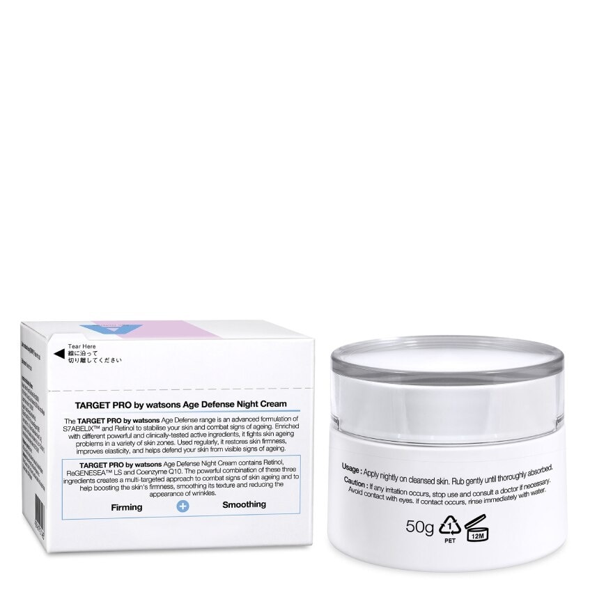 Target Pro by Watsons Age Defense Night Cream contains Retinol ReGENESEA LS and Coenzyme Q10 The powerful combination of these three ingredients creates a multi-targeted approach to combat signs of skin ageing and to help boosting the skin's firmness smoothing its texture and reducing the appearance of wrinkles Suitable for Normal and Combination skin This Age Defense range is an advanced formulation of S7ABELIX and Retinol to stabilize your skin and combat signs of ageing Enriched with different powerful and clinically tested active ingredients it fights skin ageing problems in a variety of skin zones Used regularly it restores skin firmness improves elasticity and helps defend your skin from visible signs of ageing. Promote paper packaging made with paper from responsibly managed forests, or with recycled content. Additionally, the paper used in this packaging is certified by FSC.