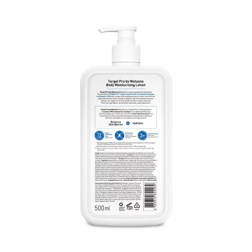 Target Pro by Watsons Body Moisturising Lotion is lightweight formula effortlessly absorbs into the skin to deliver 3 hours hydration boost to excessively dry skin areas and with proven improvement in hydration flakiness skin tightness smoothness and appearance. Our formulation ensures a body care experience that speaks to the essence of purity. Free from parabens, mineral oil, colorants, and fragrances.
