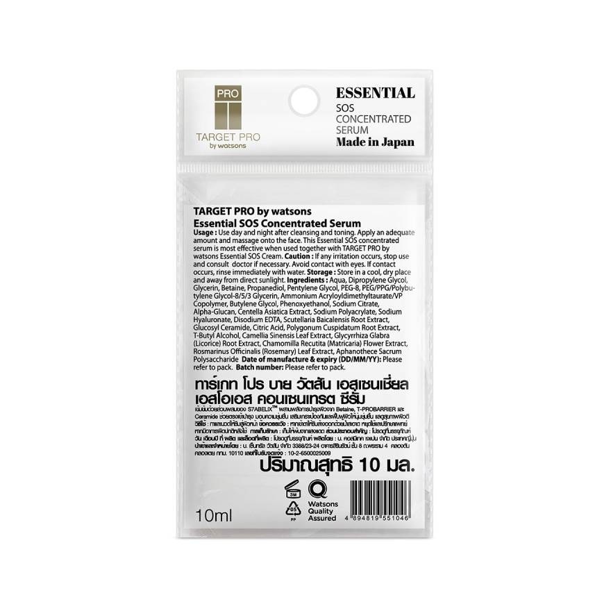 Target Pro by Watsons Essential SOS Concentrated Serum miniature 10ml. contains Betaine and Ceramide to deliver instant moisturising for up to 48 hours (100 user satisfied with efficacy of long lasting moisturising. Panel test on 20 people in Philippines). Formulated to provide long-lasting comfort, it strengthens the skin barrier and helps to reduce signs of sensitivity such as dryness, redness and itching to leave skin soft, smooth and comfortable. Dermatologically Tested for Sensitive Skin.